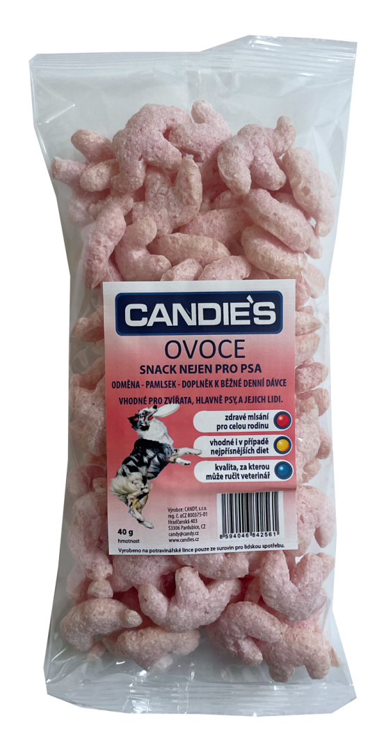 Extrudovaný cereální výrobek, z kategorie pochoutka - pamlsek, pro domácí zvířata. Křehký nízkokalorický snack ve tvaru slona (nebo kostky), se strukturou bílého jemného pečiva, s růžovým povrchem, s přirozenou nasládlou chutí a s jemnou ovocnou vůní.