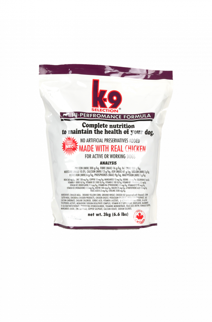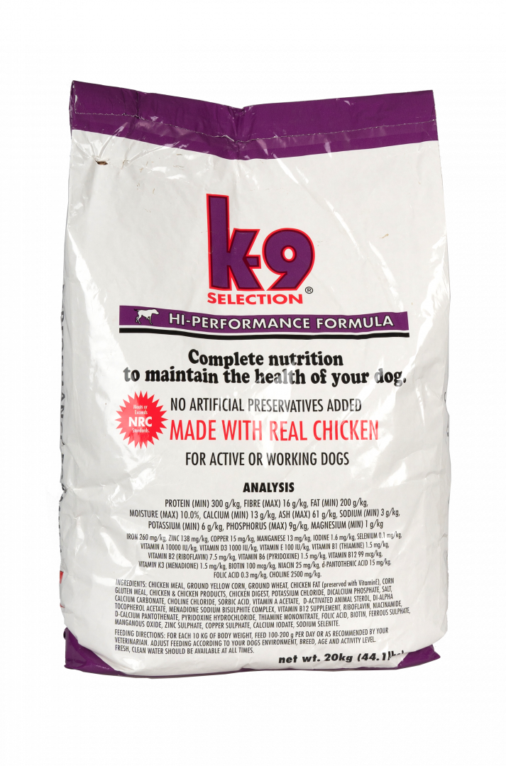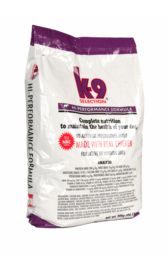 K-9 Selection HI-PERFORMANCE je krmivo pro velmi aktivní výkonné psy. Více než 60% obsahu v sušině je tvořeno kuřecími produkty poskytujícími vynikající stravitelnost, vysokou výživnou hodnotu i přitažlivou chuť. Mimořádně vhodné pro psy ve výcviku, ve sportovním tréninku, v pravidelné službě, pro psy dostihové, tažné či jinak pracovně využívané.