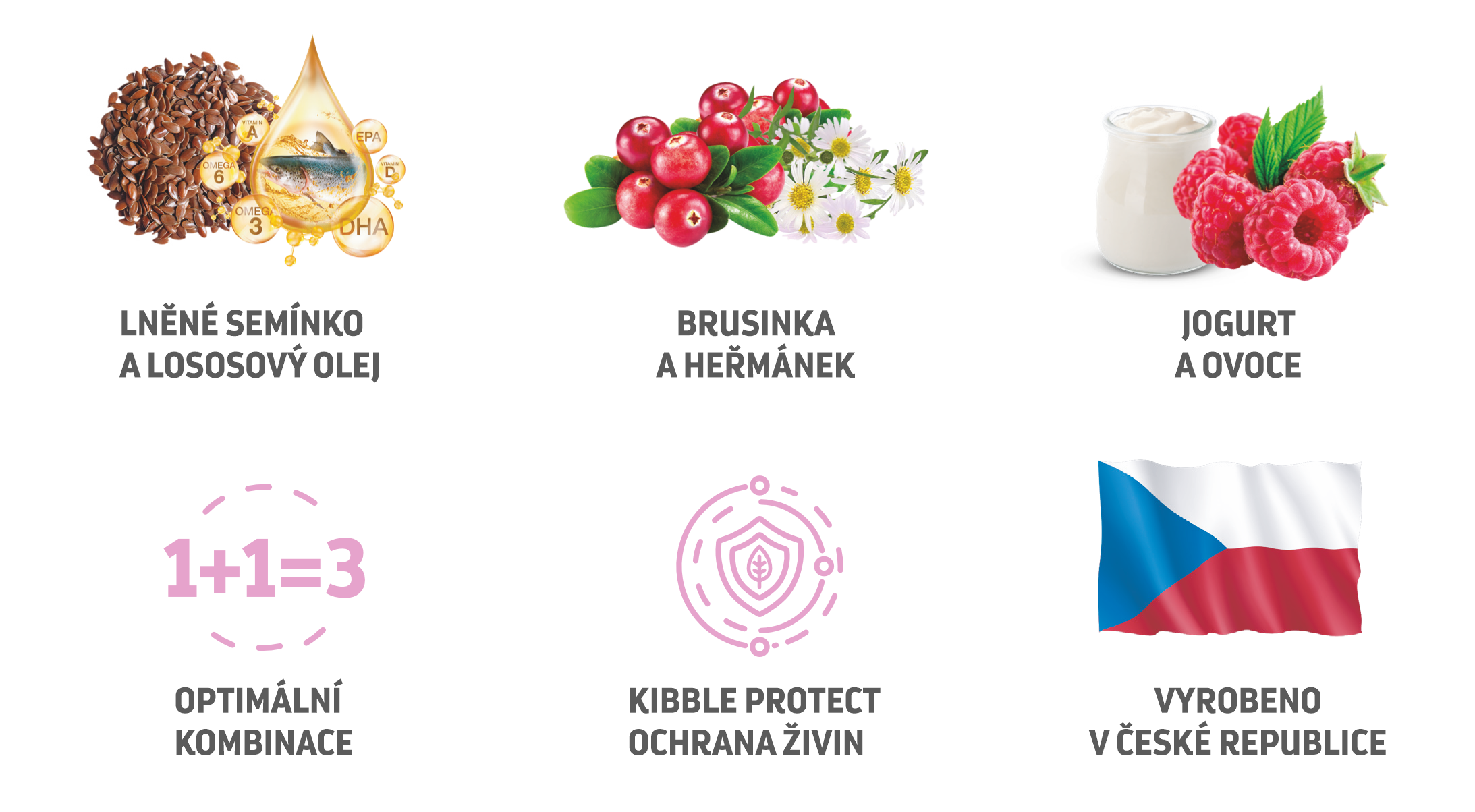 Vyvážený obsah vápníku, fosforu, hořčíku, vitamínu D a ostatních vitamínů, minerálů a esenciálních mastných kyselin pro růst, vývoj a každodenní potřeby kočky