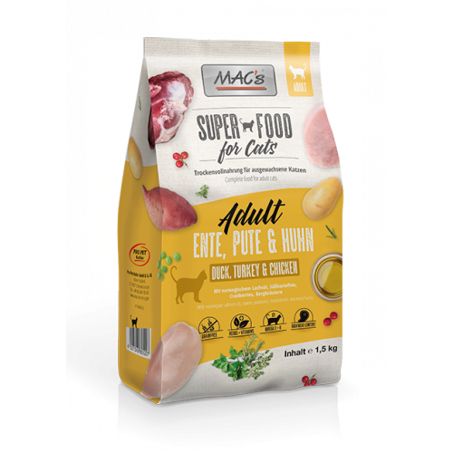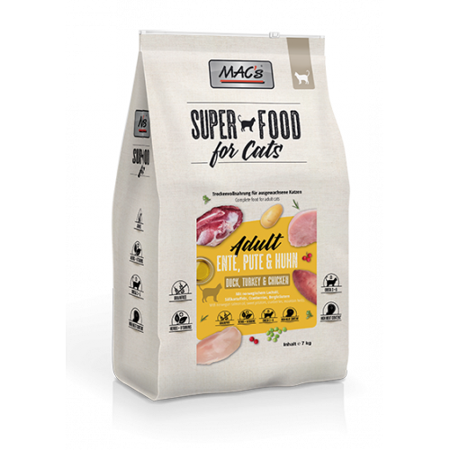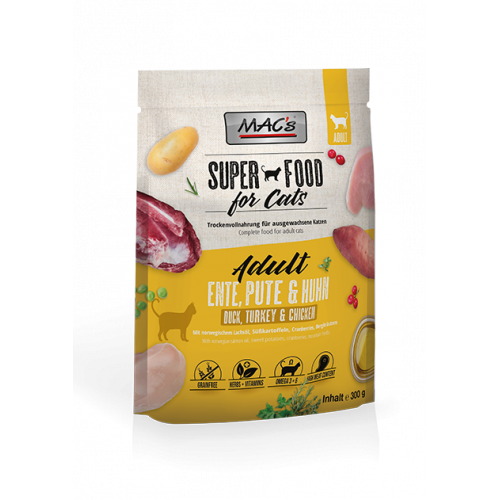 Suchá krmiva MAC´s jsou pro kočky velmi přitažlivá a chutná. Vzhledem k vysoké stravitelnosti a využitelnosti je jejich spotřeba nízká. Kočičí organismus není zbytečně opotřebováván, kočka vytváří malý úhledný nepáchnoucí bobek, který je z kočičí toalety lehce odstranitelný. Pro zpestření života kočky můžete kdykoliv kombinovat suchá krmiva MAC´s s kapsičkami, konzervami a pamlsky stejné značky. Z výživového hlediska žádné doplňky nejsou potřebné, ale vaše kočka potřebuje i svůj společenský život, komunikaci, změny a odměny od svého člověka.