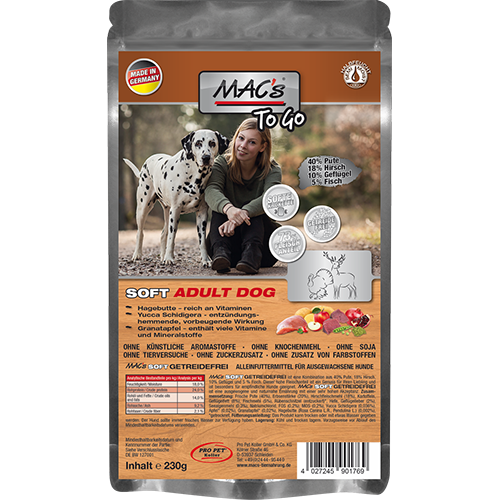 Kompletní měkké polovlhké granulované krmivo pro dospělé psy. Ve variantě "to go" 230 g vhodné jako pamlsek.